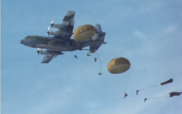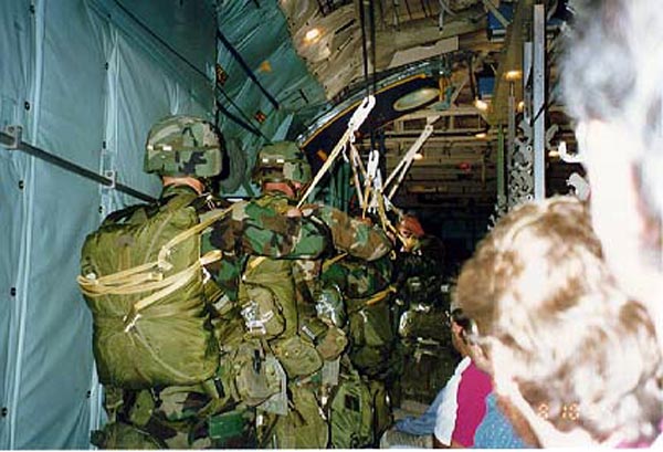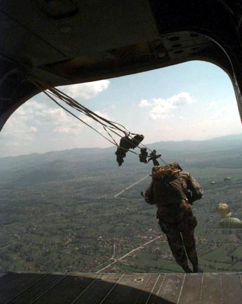 Here is a video of an actual jump. Video It's extremely worth the wait for it to download. The external view of the door is exactly what you see as you exit (if you keep your eyes open) except just watching the video doesn't let you experience the prop blast or the few seconds of free fall. Absolutely incredible. Go to Airborne School if you ever get the chance!