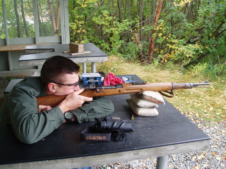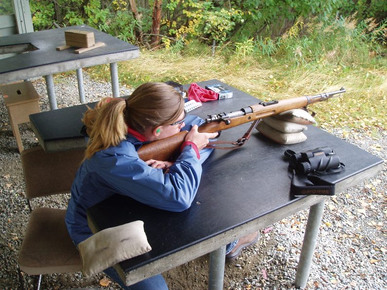 I found out last Saturday that Erika is a pretty good shot at the rifle range. We took my dad’s 8mm Mauser out and punched a few holes in some paper at 100 yards and she had quite the shot group by the time we left. For her first time shooting anything other than an M16 at USMA I was rather impressed. It’s quite a difference shooting a high-powered rifle with iron sights when all you’ve ever touched is a .223 M16 and she did a helluva lot better than the locals from Anchorage there at the range with hunting rifles and scopes.